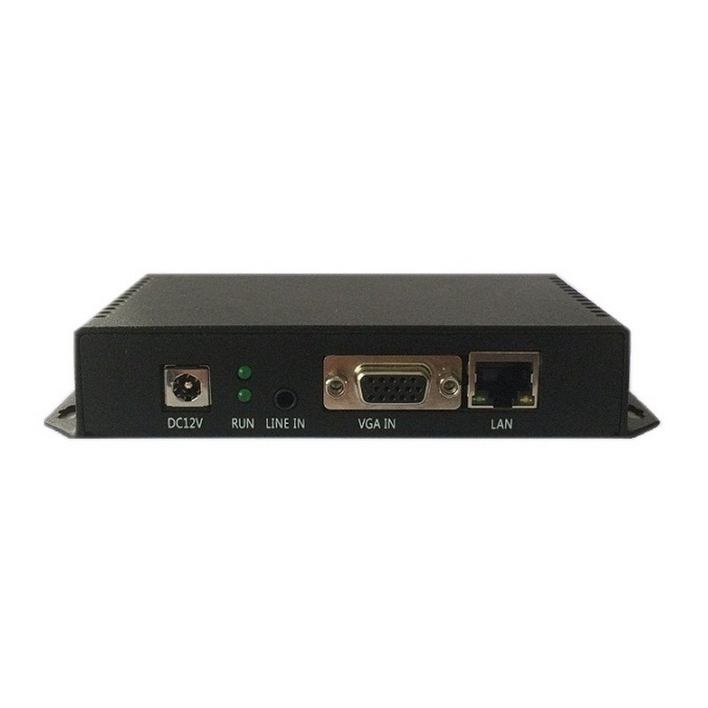 該系列產品采用華為先進的H.264/H.265網絡高清數字音視頻芯片壓縮技術,核心芯片采用Hi3516A (1080P@60FPS) ,內存為512MB。 產品概述采用新高 效H.265高清數字視頻壓縮技術,具備穩定可靠、高清晰度、低碼率、低延時等特點。輸入高清的VGA視頻頻信號,進行編碼處理,經過數字芯片壓縮處理,輸出標準的TS網絡流,該產品的推出填補了業內空白,直接取代了傳統的采集卡的方式,硬編碼方式,系統更加穩定,廣泛用于各種需要對高清視頻信號及高分辨率高幀率進行采集并基于IP網絡傳送的場合,強大的擴展性更可輕易應對不同的行業及需求,可作為視頻直播編碼器 采用工業控制精密設計,體積小,方便安裝,功率小于5W,更節能,更穩定。主要特征 ※ 采用標準H265/H264雙編碼方式 ※ 編碼幀率支持1080P 60幀 ※ 支持1路VGA、1路模擬音頻輸入 ※ 支持ONVIF協議,可支持NVR錄播 ※ 音頻編碼支持AAC/G711 ※ 音頻支持左右聲道,支持音量大小調節 ※ 碼流控制:CBR/VBR碼率控制,16kbit/s~12Mbit/s ※ 網絡接口采用1000M 全雙工模式 ※ 支持RTSP、RTMP、RTP、UDP組播、UDP單播等協議(RTMP支持輸入用戶名、密碼功能) ※ WEB操作界面,中英文配置界面可選,可修改密碼 ※ 支持網絡遠程管理、升級。 ※ 支持主流、副流多協議多碼流輸出 ※ 支持局域網LAN、廣域網WAN傳輸 ※ 支持三組中文、英文、圖片OSD,字體大小可調,可設置到屏幕任意位置。 ※ 支持DHCP自動獲取IP ※ 支持一鍵恢復默認設置 ※ 支持多品牌機頂盒解碼 應用拓撲圖詳細信息產品型號VGA高清編碼器60幀視頻輸入視頻輸入接口1路VGA視頻接口輸入分辨率1080P\720P\1600x1200\1400x1050\1440x900\1280x1024\1280x960\1280x800\1024x768\800x600等常規分辨率音頻輸入音頻輸入接口1路3.5mm模擬音頻視頻編碼參數視頻編碼H.265 Main Profile編碼H.264 Baseline Profile編碼H.264 Main Profile編碼H.264 High Profile編碼編碼后的尺寸1920*1080\1280*720\720*576\640*480\\352*288\等視頻碼率CBR/VBR碼率控制 16Kbps-12Mbps視頻幀率60幀音頻編碼AAC/G711可選音頻碼率64Kb/s~384Kb/s字幕添加文字,圖片網絡參數網絡接口1個RJ45,100M/1000M自適應以太網口網絡協議支持RTSP、RTMP、UDP、組播、單播碼流類型TS標準流、雙碼流接口協議ONVIF配置管理WEB配置,遠程升級常規參數電源DC12V 1A功耗不大于5W工作溫度-20℃~60℃工作濕度<90%,無冷凝尺寸(長*寬*高)12.5cm*9cm*2.5cm重量0.3Kg
